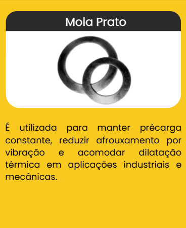 As Molas Prato são utilizadas para manter pré-carga constante, reduzir afrouxamento por vibração e acomodar dilatação térmica em aplicações industriais e mecânicas.